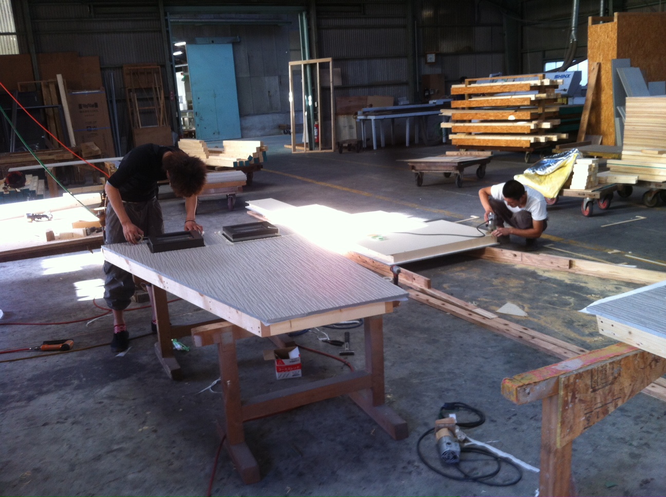 三重支店の土井です。 みなさん暑い中お疲れ様です。 今日は工場内の仕事を紹介したいと思います。 今日作っているのは妻壁パネルで角度がついたむずかしい壁です。 時間がかかるので、皆で一つになって一気に仕上げます。 協力体勢が出来てきたので皆で一つになってよい商品づくりにつとめたいです。