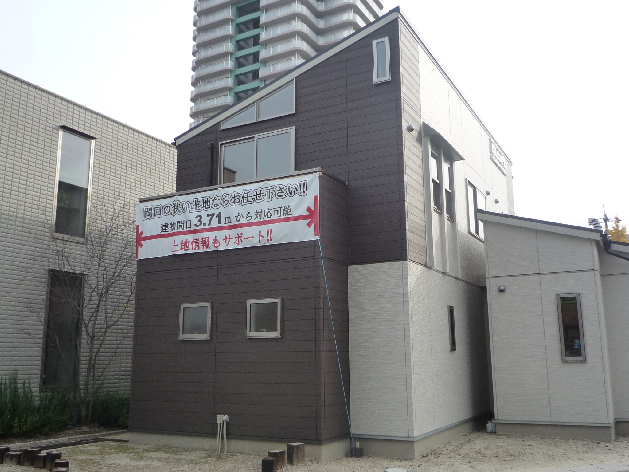 さて最近、上写真のようにモデルハウスの外壁にフラッグを取付し、近くを通られたお客様に、