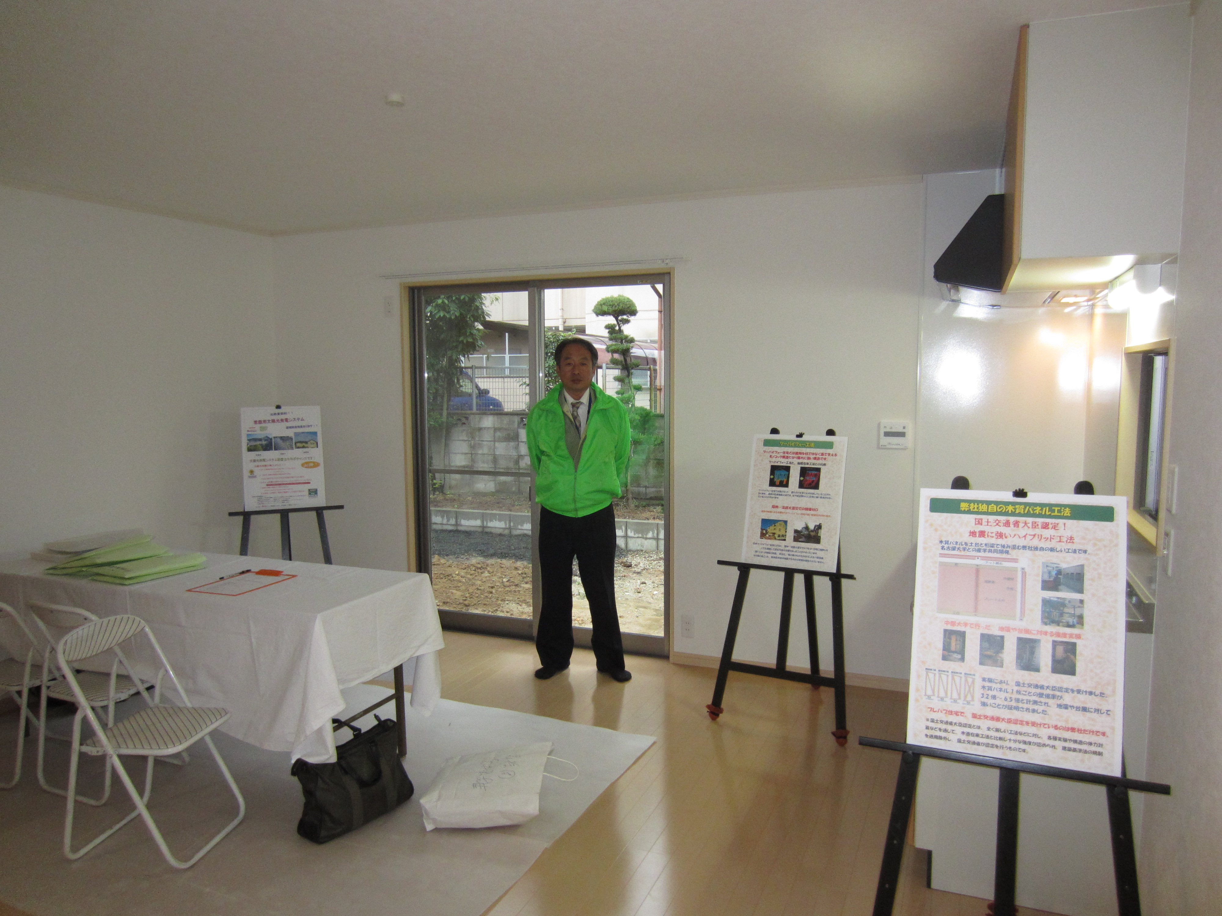道下本部長と佐古さんがセッティングしてくれました。生憎の雨天で見学客は多くはありませんでしたが、住宅展示場と同じ説明パネルを用意したので、営業も『展示場と同じ説明が出来る。お客様も説明パネルを勝手に見ながら、納得していました。』と好評でした。良いと思った事は、どんどんしていきます。