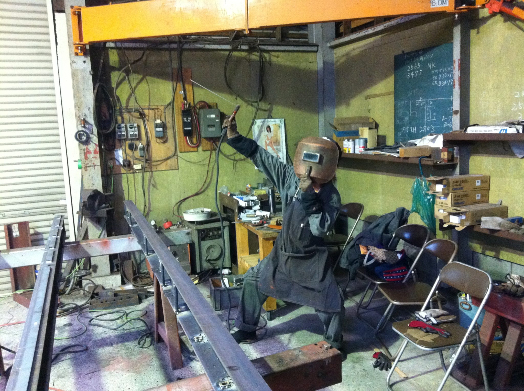 今日は有竹と鉄骨土台の溶接をしました。   写真を見てわかるように、溶接は非常に強い光を放ちます。 この光で目がやられるんですわ。 もう痛いんです。 今日の仕事はこんな感じですね。