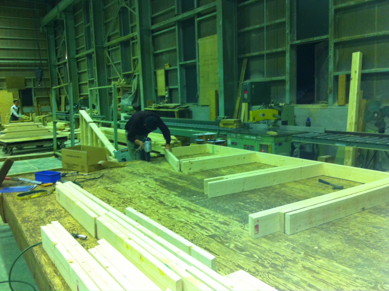 三重工場 伊藤(徳)です。 天気のいい日が続きますね。 年末に向けて2×4の建方がたてこんできているので 体をこわさないよう頑張ります。 今日は中国からの研修生の張さんと妻壁をつくりました。