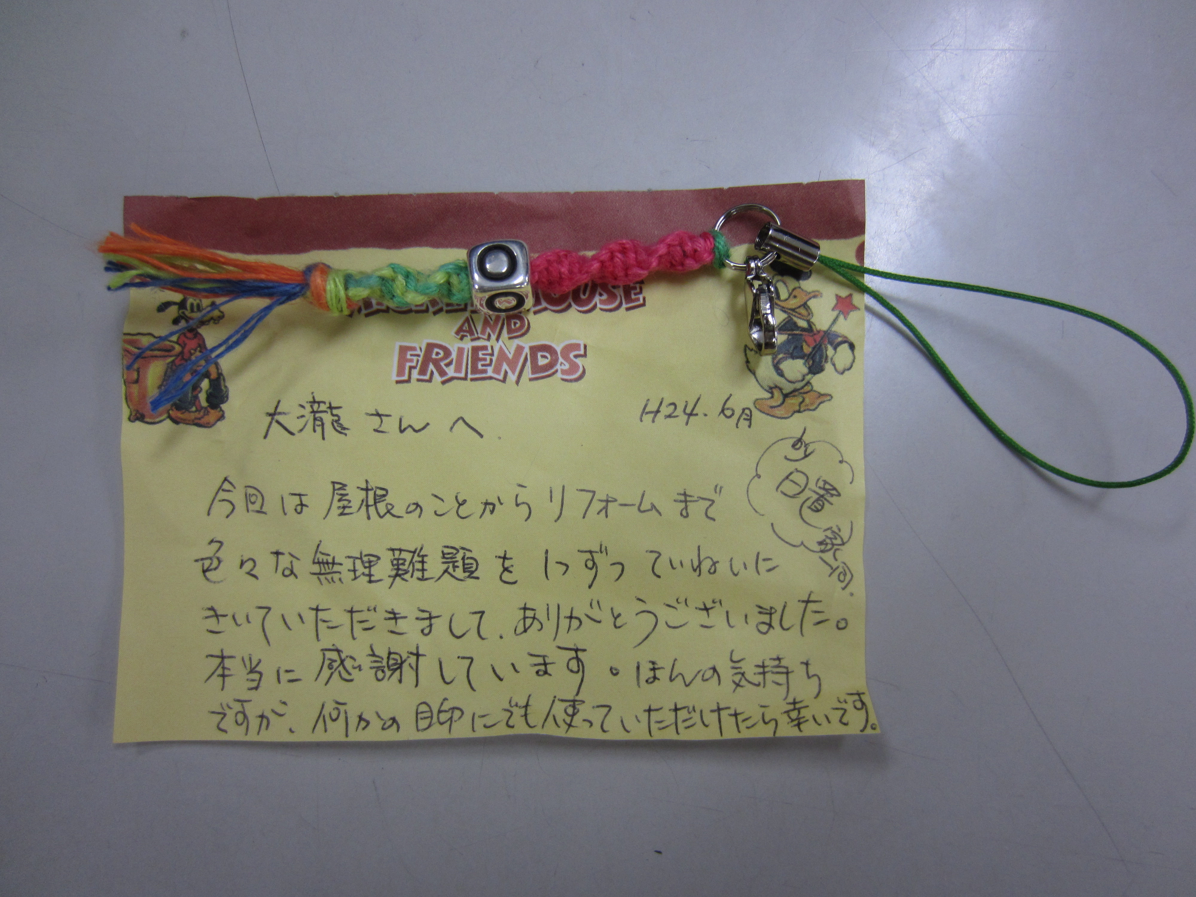 社長の酒井です。昨日、大瀧支店長がリフォーム工事させていただいたH様宅にお邪魔してきました。10年程前、私が営業をしていた頃にH様の若夫婦さんからリフォームの相談を受けて訪問した記憶があり、懐かしく思いお邪魔させていただきました。H様より、以前リフォームの計画を中止した経緯を説明いただき、今回は当社の近くに用事がありその帰りになんとなくお寄りいただいたそうです。リフォーム中の支店長の対応、お邪魔した新入社員の伊藤君の挨拶や気持ちの良い職人さんをお褒めいただきました。今秋には、畳の入替やお風呂の改装計画の依頼をいただく、有難いお言葉もいただきました。H様ご夫婦と支店長の写真を撮らせていただこうと思いましたが、昔、伊勢に旅行した時依頼ご夫婦での写真は撮った事が無いとの事で(照れていらゃったと思います。素敵なご夫婦と思います。)、奥様は壁の後ろに隠れた写真となってしまいました。最後に、手土産までいただきありがとうございました。(自宅で採れたきゅうりは、本日おいしくいただきました。)写真は、支店長が若奥様からいただいた手作りのストラップです。(大瀧のOの文字が入っています。)H様のお宅を訪問にあたり、私も2年前までいなべに住んでいましたので、こちらの人情味あふれるお客様との接点で心が暖かくなりました。