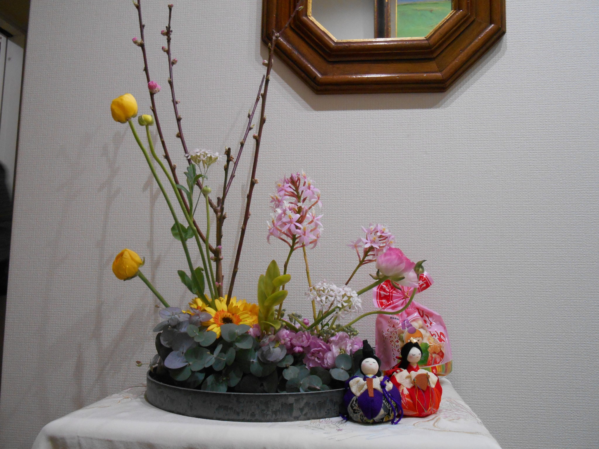 DSCN0596 DSCN0597 3月3日は桃の節句です。 子供の頃は、姉や妹と一緒にお雛様を飾ることが楽しかった思い出があります。 最近は、布製、木製等でコンパクトなセットがたくさん出ています。 私も子供のころを思い出して、お花と一緒に飾ってみました。   酒井